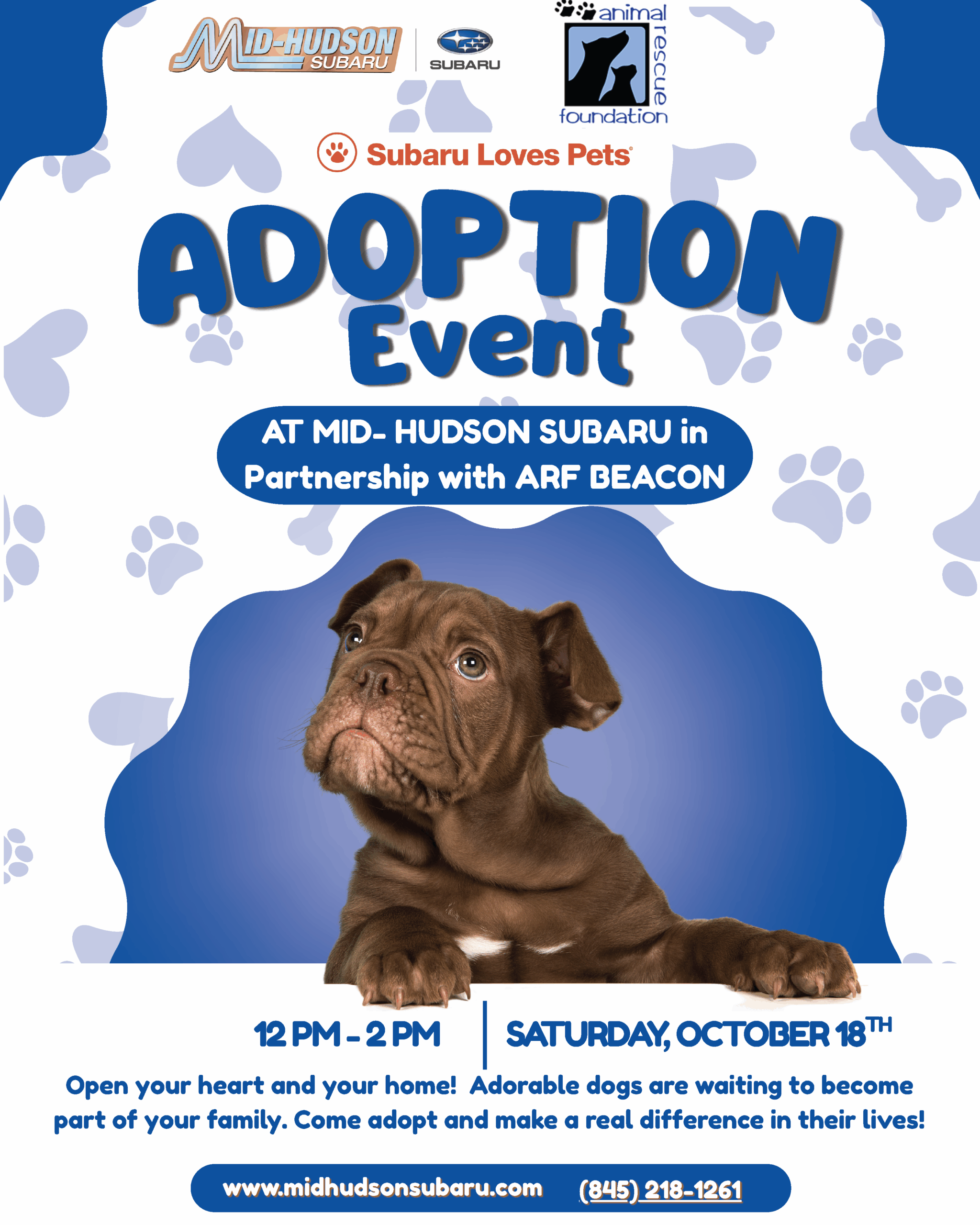 Our wonderful friends at Mid Hudson Subaru are hosting an adoption event for ARF on Oct. 18, from 12:00-2:00 pm. Please stop by to meet some of our adorable pups!